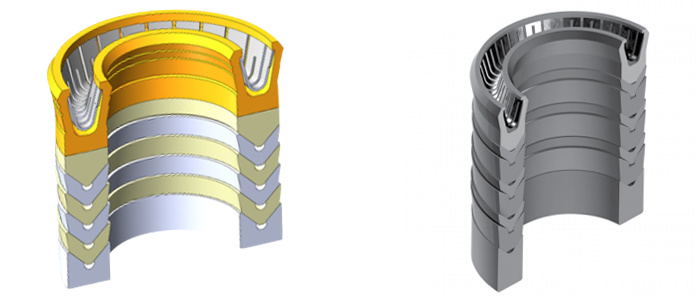 加壓柔性密封件身會(huì)自動(dòng)為堆疊在其后面的一系列V形段提供能量,從而將唇口向外推。通過(guò)這種方式產(chǎn)生的多個(gè)密封區(qū)域減少了泄漏的風(fēng)險(xiǎn)。每個(gè)V形環(huán)對(duì)壓力沖擊和甚至輕微的壓力變化作出反應(yīng),從而提供即時(shí)的密封效果。